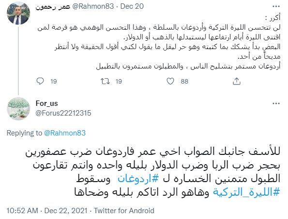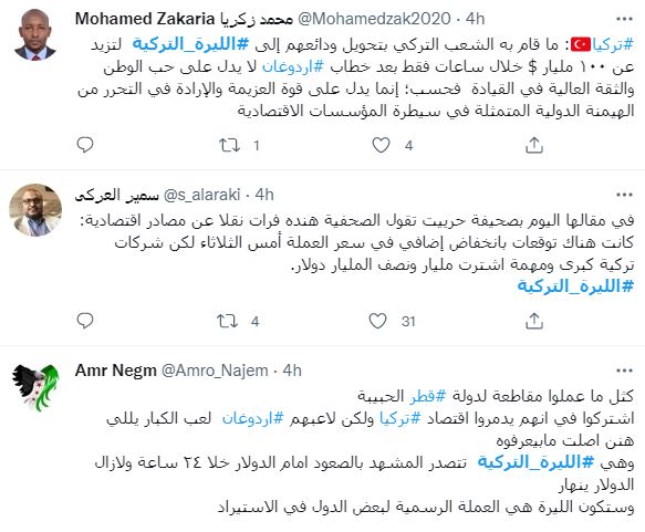 وعلق الصحفي المصري علي عبدالعال قائلا: “بكلمة من الرئيس التركي أردوغان #الليرة_التركية تعاود الارتفاع 30 % أمام الدولار ، فماذا قال #أردوغان ؟ قال: “بصفتي مسلم سأستمر في القيام بما تفرضه النصوص الشرعية، الحرب ضد الفائدة قائمة، لا تتوقعوا مني شيئا آخر” الرجل مستمر في محاربة المعاملات الربوية، ووعد بتعويض المتضررين ،النتيجة : المصارف التركية تشهد تحويل مليار دولار إلى الليرة بعد نحو ساعتين من خطابه”.