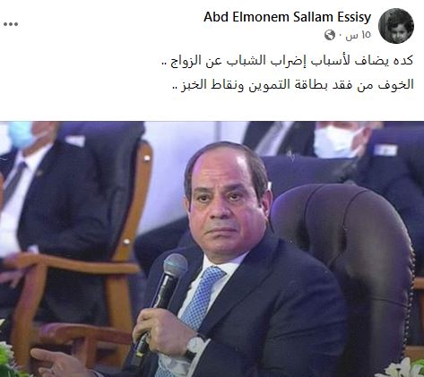 أما المعلم هاموش @m3lm_hmosh222 فكتب "طيب ما أنت عارف أن الشباب مش عارف يصرف بعد الجواز، إيه اللي أنت وفّرته لهم عشان يجوز؟ بدل ما تلغي بطاقة التموين وفر لهم شغل وعيشة كريمة، سبحان الله كل ما تعمل مؤتمرات ربنا يفضحك أكتر، خلي ربنا يعجل بهلاكك #جمهورية_مرفت #الشعب_مماتش #الشعب_قادر_عالتغيير".