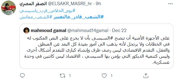 وأضاف حساب @svetalanka510 إن "الشعب المصري لازم ينزل الشوارع والميادين، علشان الحيوان ده لازم يمشي ويرحل فورا عن حكم مصر، علشان خلاص كده الحيوان ده تخطى كل حدود البجاحة اللي في الدنيا بالكلام الأخير اللي طلع قاله ده #الشعب_قادر_عالتغيير".