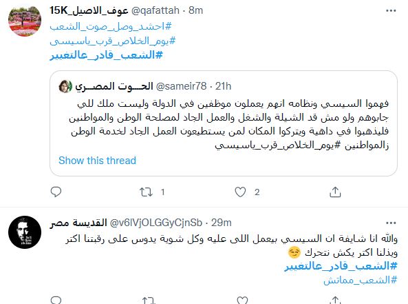 تصدر هاشتاج #الشعب_قادر_عالتغيير وسط غضب من الناشطين على مواقع التواصل الاجتماعي، من تصريحات المنقلب أثناء افتتاح محطة تكرير البنزين في أسيوط، ورغبة منهم في ثورة تواجه الظلم الذي عمَّ، والبلاء الذي طمَّ، وأغرق البلاد في وحل الديون، فضلا عن وقف الحال الذي يشتكي منه أغلب المصريين.