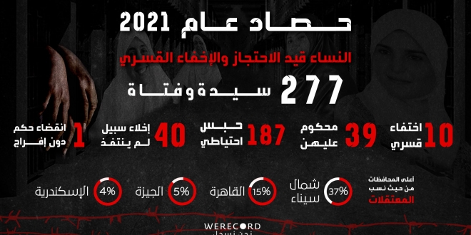 رصدت منظمة "نحن نسجل" الحقوقية في حصادها عن عام 2021 احتجاز وإخفاء 277 سيدة وفتاة، بينهن 187 قيد الحبس الاحتياطي و10 مختفيات قسريا و39 محكوم عليهن و40 سيدة حاصلة على إخلاء سبيل لم ينفذ، وسيدة واحدة لم يُفرج عنها بعد انقضاء الحكم.
