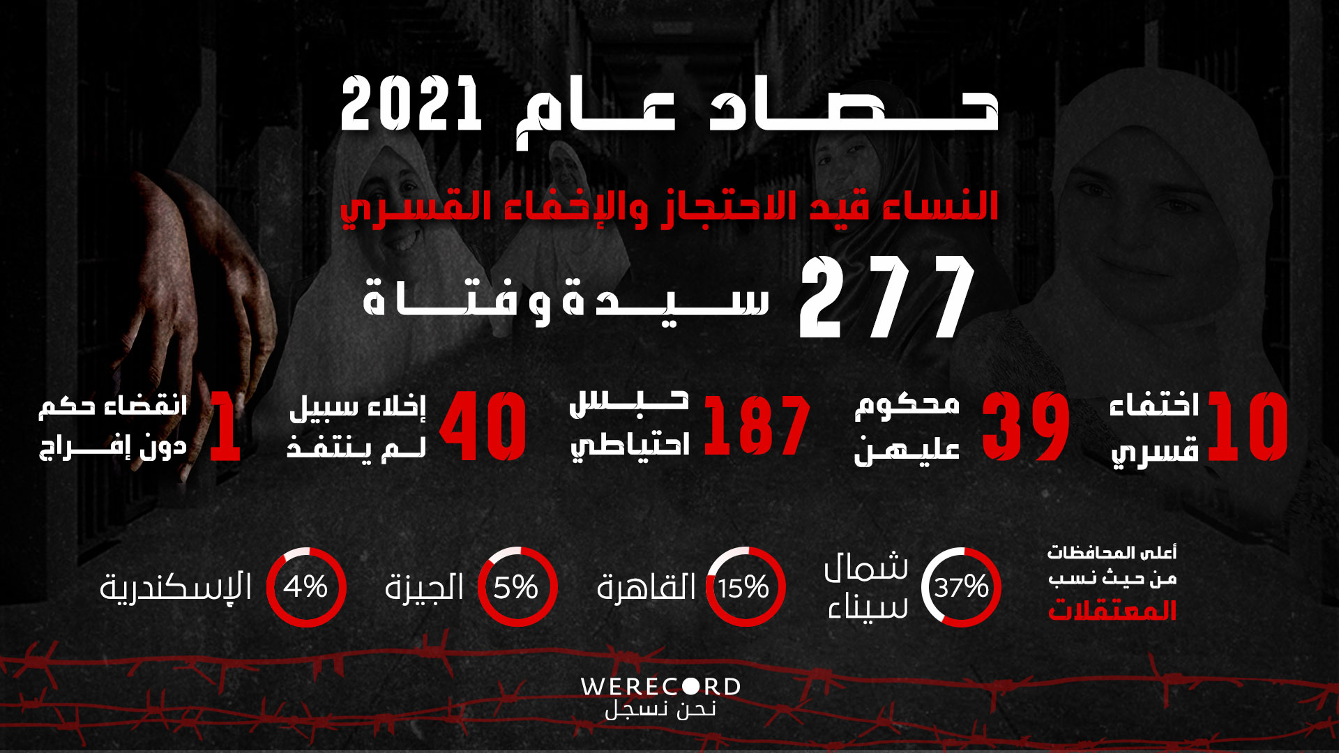 رصدت منظمة "نحن نسجل" الحقوقية في حصادها عن عام 2021 احتجاز وإخفاء 277 سيدة وفتاة، بينهن 187 قيد الحبس الاحتياطي و10 مختفيات قسريا و39 محكوم عليهن و40 سيدة حاصلة على إخلاء سبيل لم ينفذ، وسيدة واحدة لم يُفرج عنها بعد انقضاء الحكم.