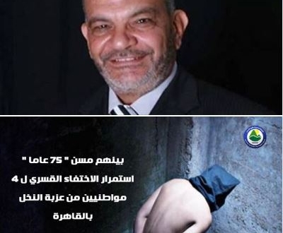 إلى ذلك وثقت الشبكة المصرية الإخفاء القسري لأربعة مواطنين منذ اعتقالهم تعسفيا من أمام المسجد الكبير بعزبة النخل بالقاهرة بعد صلاة العشاء يوم الجمعة الماضية، واقتيادهم لجهة مجهولة حتى الآن دون سند من القانون.