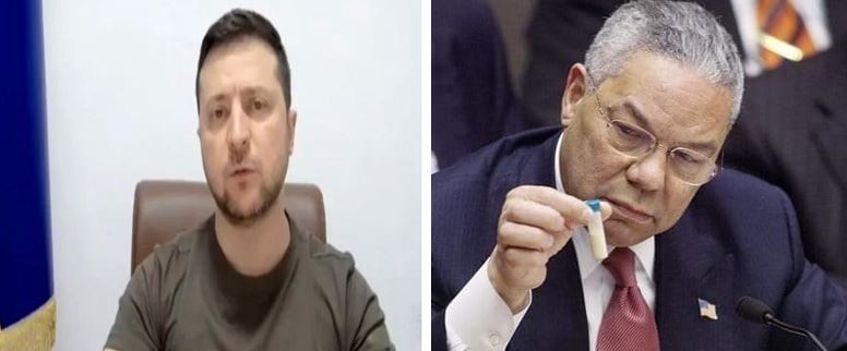 في الوقت الذي، سجل فيه وزير الخارجية الأمريكي في 2003، الراحل في أكتوبر الماضي 2021 (كولن باول)، قبل سنوات اعترافا قال فيه "أشعر بالعار لتبرير غزو العراق بناء على كذبة أسلحة الدمار الشامل" يعتبر الرئيس الأوكراني فولديمير زيلنسكي أن "التهديد الذي نواجهه في أواكرانيا يشبه التهديد الذي تواجهه إسرائيل".