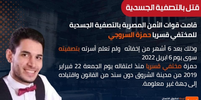 وقالت المنظمة إن قوات الانقلاب قامت بالتصفية الجسدية للمختفي قسريا حمزة أحمد سيد محمد السروجى الطالب بكلية الدراسات الإسلامية بجامعة الأزهر بعد 6 أشهر من إخفائه ولم تعلم أسرته بتصفيته سوى أمس الأربعاء 6 إبريل.