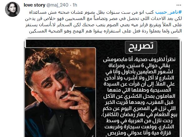وقال حبيب “نظرا لظروف صحية، أنا ما بصومش بقالي حوالي 6 سنين، ومراعاة لشعور الصايمين بحاول وأنا في الشارع لا آكل ولا أشرب ولا أدخن على الملأ" مضيفا أنه نظرا لحالة الأسرة الكتابية التي عرضت مشكلتها على الفيسبوك، قرر المجاهرة بفطره منتظرا العنف اللفظي والبدني لمن يعترض مدعيا أن له عذرا.