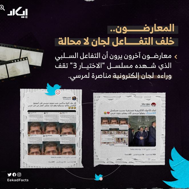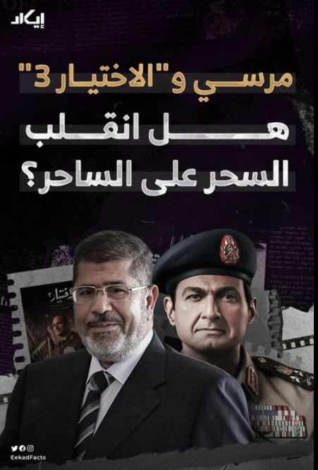 أجرى فريق التحقق الرقمي "إيكاد" تحليلا للتفاعلات على وسائل التواصل مع مسلسل "الاختيار 3" لمعرفة تأثير المسلسل على شعبية الرئيس الراحل محمد مرسي، وأوضحت نسبة التغريدات الإيجابية عن مرسي وصلت إلى 61% من التغريدات، في حين أن نسبة التغريدات السلبية وصلت إلى 38% فقط، طارحة السؤال والنتيجة في آن "هل انقلب السحر على الساحر؟