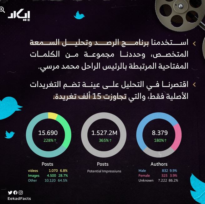 منصة (Eekad – إيكاد) عبر تويتر (@EekadFacts) تعرف نفسها أنها منصة تحقيقات "استخبارات المصادر المفتوحة" أجرت إحصائية على عينة مكونة من 15 ألف تغريدة، خلال فترة زمنية محددة من 2 إلى 11 أبريل يستقصي تحليل التفاعلات من خلال فريق التحليل الرقمي من خلال برنامج الرصد وتحليل السمعة المتخصص وبتحديد مجموعة الكلمات المفتاحية المرتبة بالرئيس الشهيد محمد مرسي.