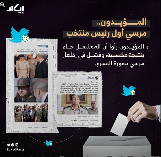 وأشارت التعليقات ومحتوى نشرته "إيكاد" إلى تأكيد عملي وفعلي من أن نظام السيسي أنفق الملايين على إنتاج مسلسل الاختيار٣، بهدف تشويه صورة الشهيد مرسي، ولكن النتيجة جاءت عكسية، فقد رفع هذا المسلسل من شعبية الشهيد.