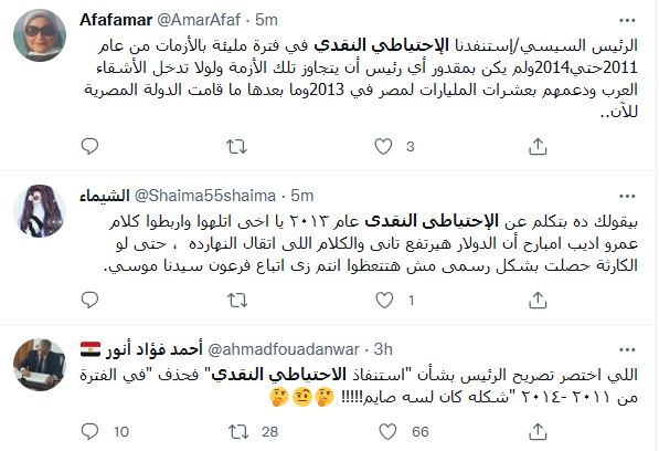 ومن اللجان كتب حساب (@walaagamal6786) "للمدلسين اللي اقتطعوا كلام الريس ، استنفذنا الاحتياطي النقدي في فترة مليئة بالأزمات من ٢٠١١ حتى ٢٠١٤ ولم يكن بمقدور أي رئيس أن يتجاوز هذه الأزمة".