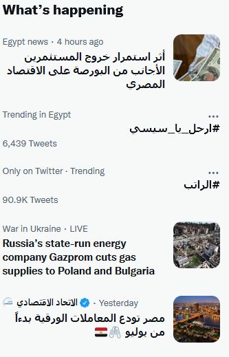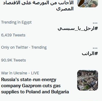 تصدر هاشتاج #ارحل_يا_سيسي موقع "تويتر" لليوم الثاني على التوالي، مكررا تصدره ربما لعشرات المرات السابقة خلال السنوات الأخيرة من حكم العسكر، وكانت هذه المرة لافتة بعد أن جاءت مع تكرار من زعيم الانقلاب الدعوة إلى حوار وطني يشمل الجميع فيستضيف كومبارس انتخابات 2014 حمدين صباحي الذي لجأ عازفا عن تبعات قول الحق في الشارع السياسي إلى المطبخ ، كما استضاف أيضا مخرج 30 يونيو ونائب الفيديوهات الإباحية خالد يوسف.
