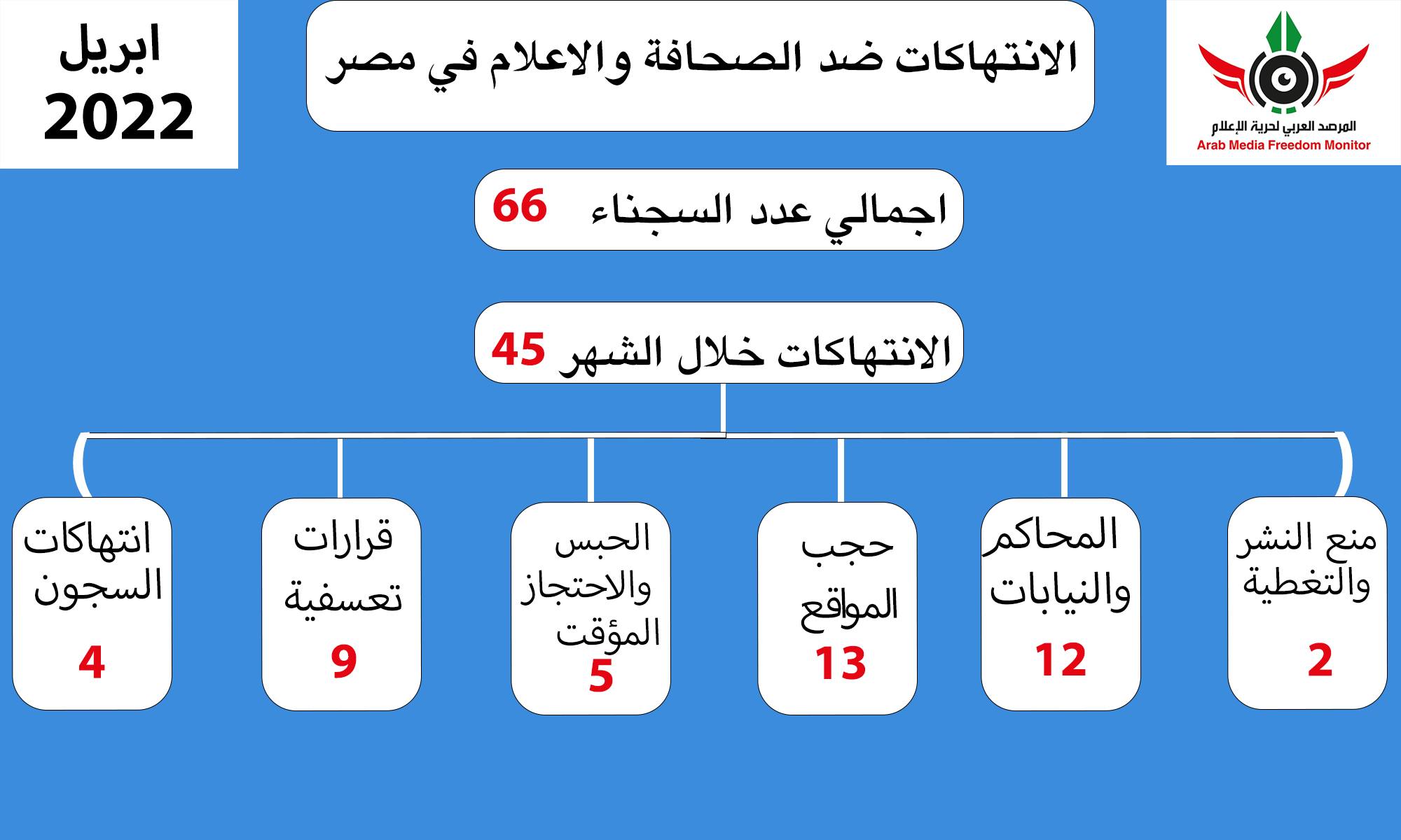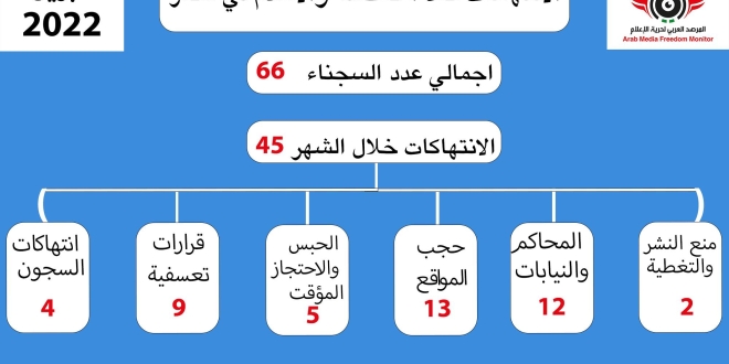 ووثق المرصد في تقريره انتهاكات حرية الإعلام في مصر عن شهر إبريل المنقضي 45 انتهاكا متنوعا واستمرار حبس 66 صحفيا وإعلاميا بما يؤكد استمرار سلطات الانقلاب في تكبيل الحريات وإغلاق المجال العام.