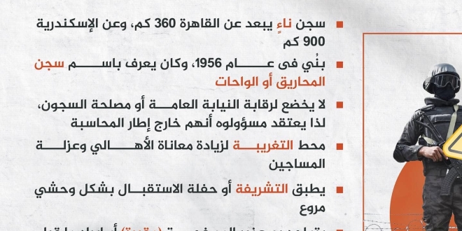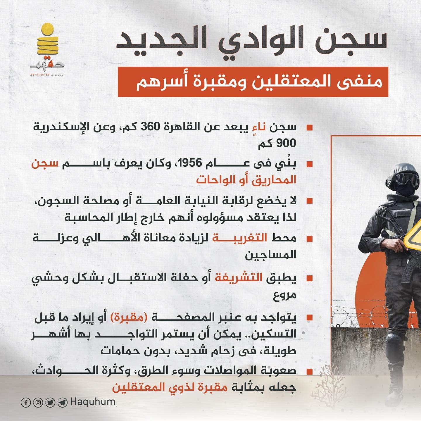 ويعد سجن الوادي الجديد منفى للمعتقلين ومقبرة لأسرهم فهو سجن بعيد، يبعد عن القاهرة 360 كم، وعن الإسكندرية900 كم وتم بناؤه عام 1956 ، وكان يعرف باسـم سجن المحاريق أو الواحات ولا يخضع لرقابة النيابة العامـة أو مصلحة السجون، لذا يعتقد مسؤولوه أنهم خارج إطار المحاسبة ويطبق التشريفة أو حفلة الاستقبـال بشكل وحشي مروع .