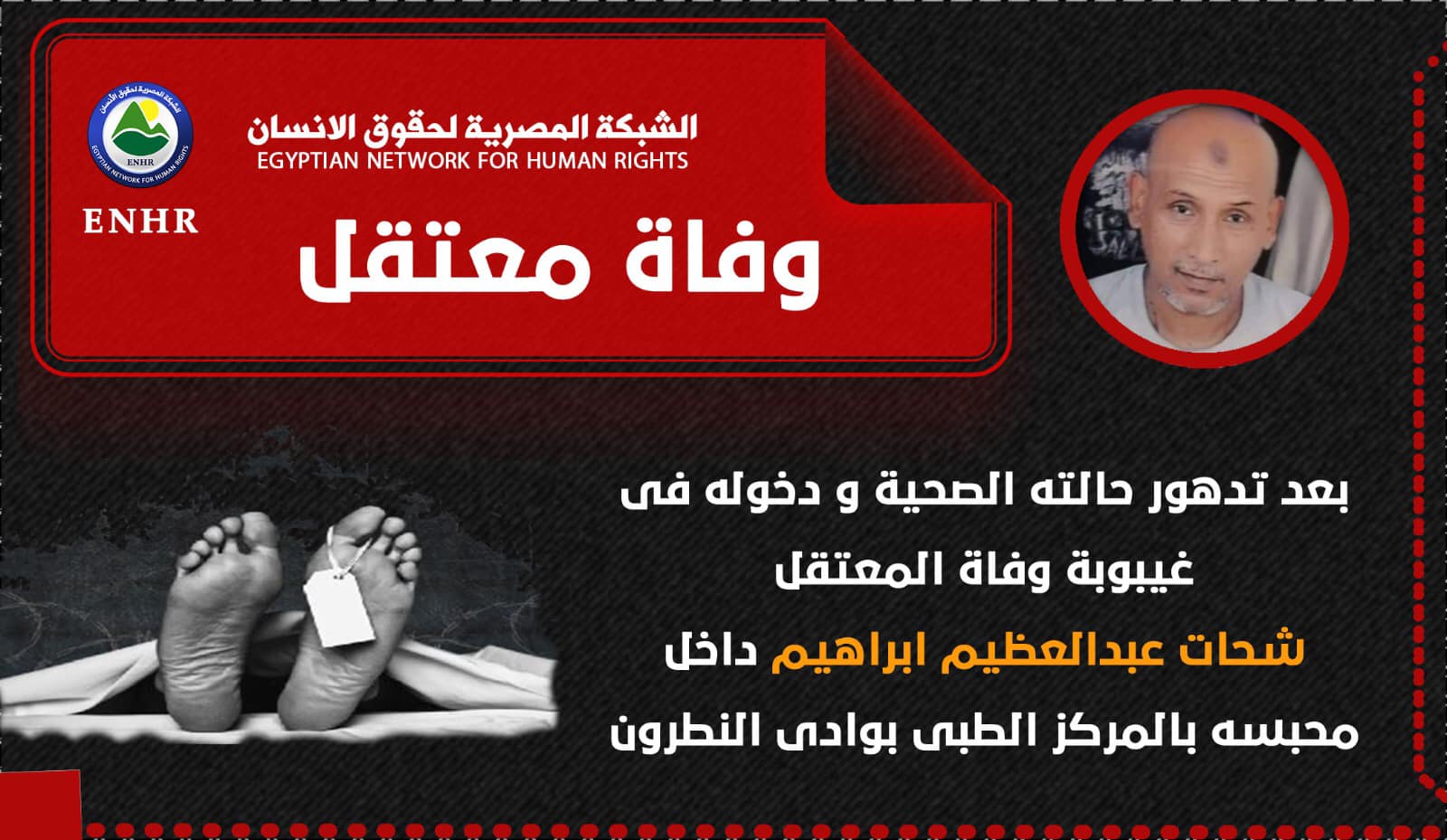 وثقت الشبكة المصرية لحقوق الإنسان استشهاد المعتقل "شحات عبد العظيم إبراهيم" من مدينة إدفو محافظة أسوان، نتيجة لما تعرض له من إهمال طبي داخل محبسه وعدم حصوله على حقه في العلاج والرعاية الطبية المناسبة داخل سجن وادي النطرون .