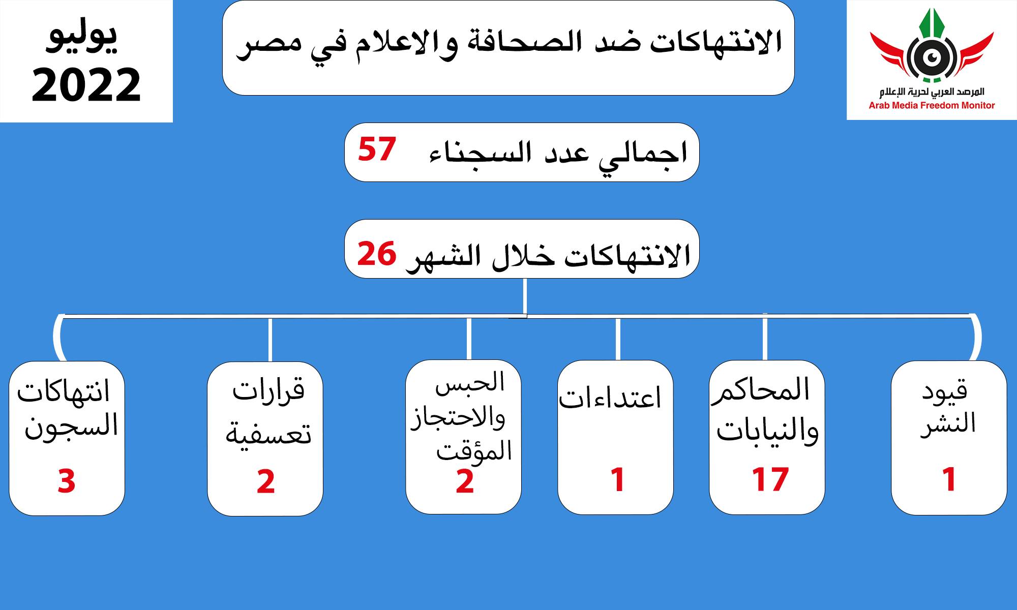 ووثق المرصد 26 انتهاكا متنوعا في تقريره لانتهاكات حرية الإعلام في مصر خلال شهر يوليو 2022 مع استمرار حبس 57 صحفيا وصحفية .