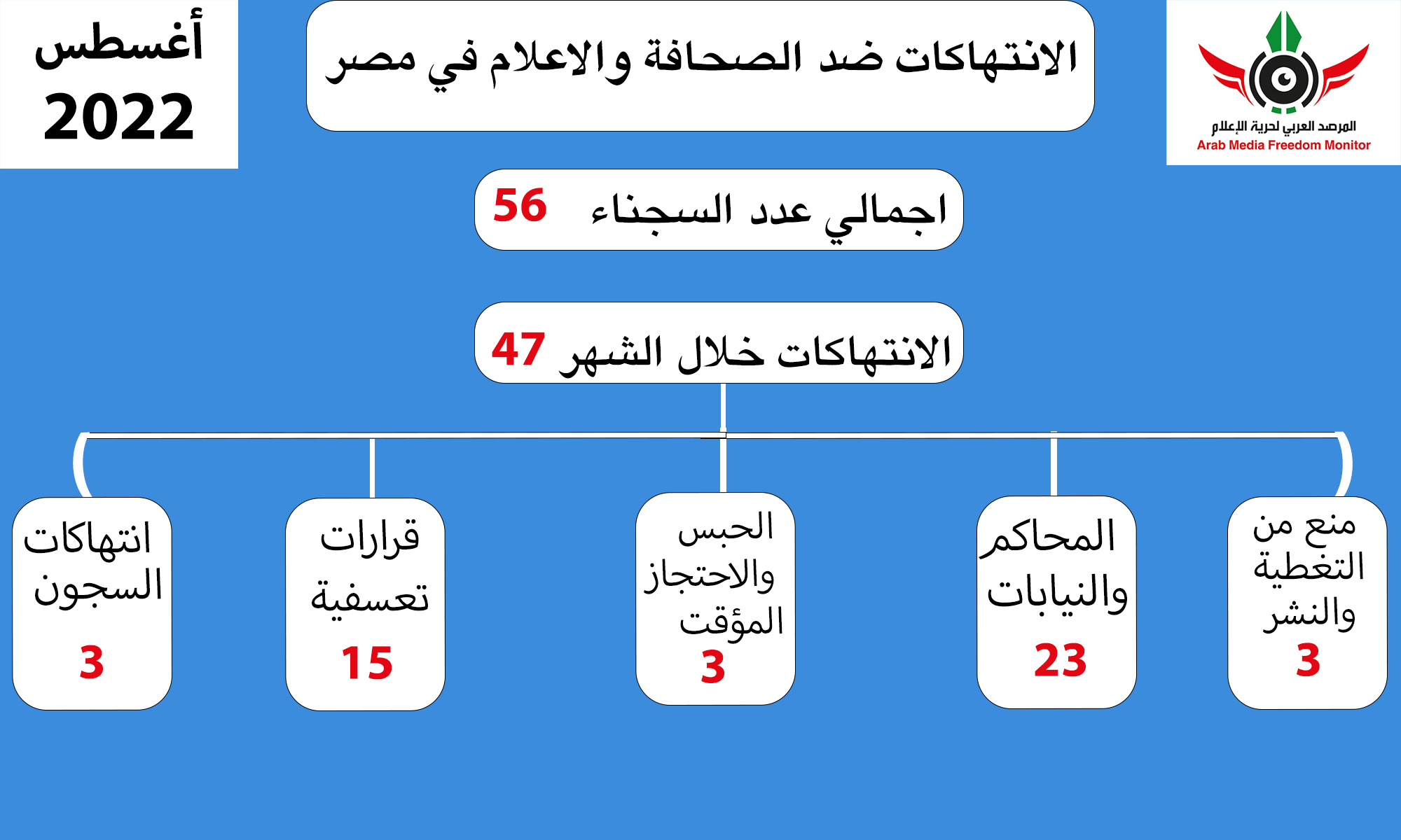 كشف المرصد العربي لحرية الإعلام في تقريره عن  انتهاكات حرية الإعلام في مصر خلال شهر أغسطس 2022 المنقضي  (٤٧) انتهاكا متنوعا ، وأكد على استمرار الانقلاب لنهج حبس الصحفيين والانتهاكات في السجون .