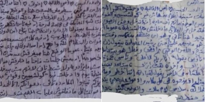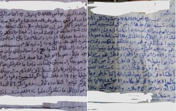 وقالت الرسالة الثانية "السلام عليكم والدي الحبيب أمي الغالية إخوتي أشتاق إليكم جميعا للأسف الأمن الوطني سيطر على السجن هنا والوضع مبقاش يختلف عن العقرب كثيرا غير أن الغرف أوسع".