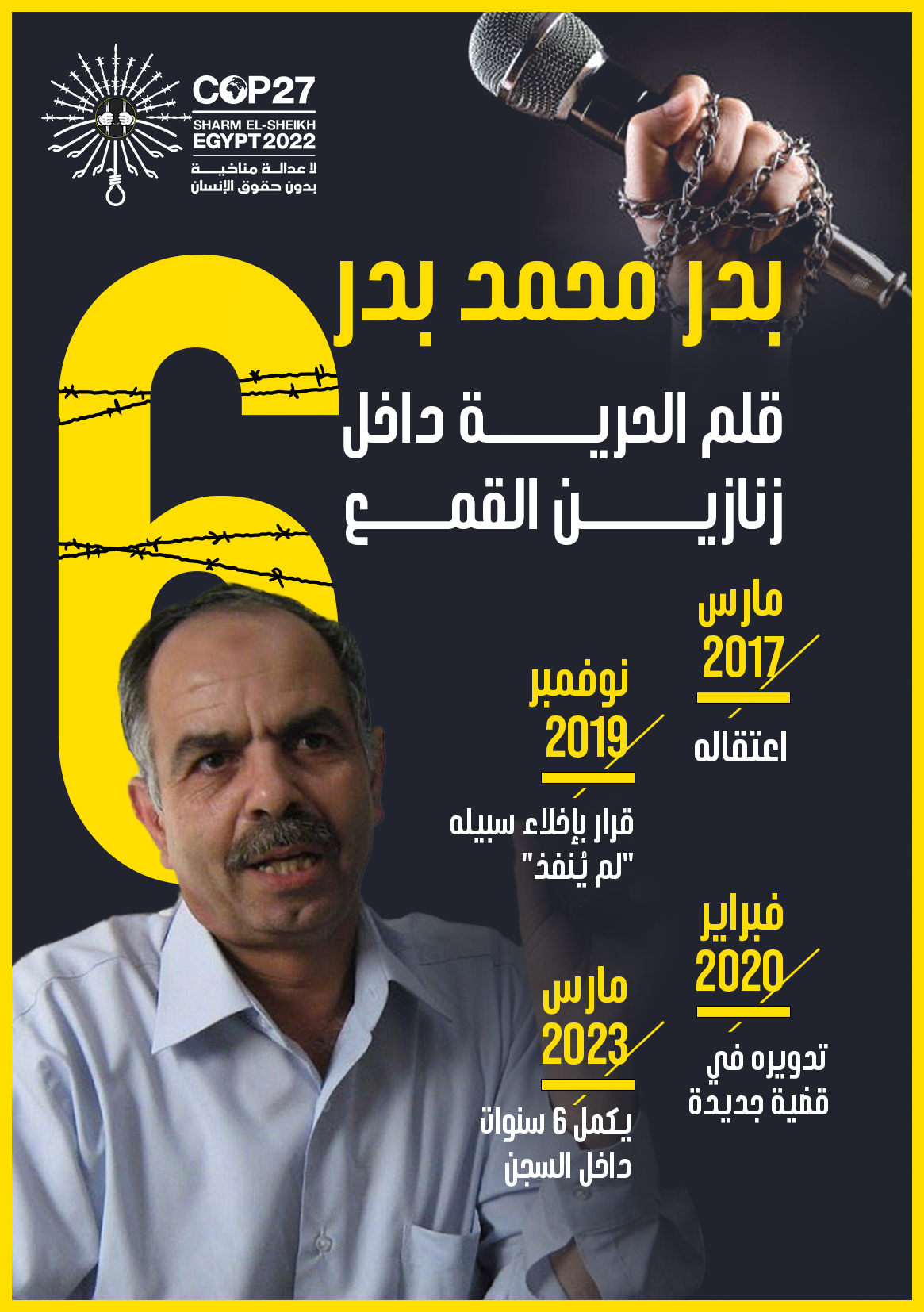 كما رصد المركز الحقوقي ما يحدث من انتهاكات ضد الكاتب الصحفي بدر محمد بدر رئيس تحرير صحيفة "الأسرة العربية" السابق، وطالب بوقفها وسرعة الإفراج عنه وعن جميع معتقلي الرأي.
