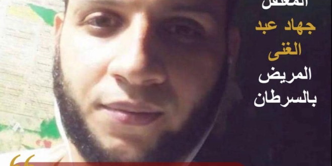 وقالت الشبكة إنها "تلقت استغاثة عاجلة من أسرة المعتقل الشاب جهاد عبد الغني محمد سليم ، 32 عاما، والمصاب بسرطان الفك والحلق، والمتواجد حاليا بالمركز الطبي بسجن بدر للاصلاح والتأهيل، وذلك بعدما فقد الأمل في الشفاء، نظرا لتدهور حالته الصحية بشكل سريع، بعد احالته منذ 4 أيام إلى قسم الرعاية المركزة بالمركز الطبي بمركز بدر للإصلاح والتاهيل".