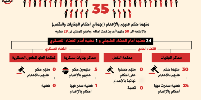 وذكرت أن أحكام الإعدام صدرت من محكمة الجنايات في 24 قضية وشملت 30 شخصا ، يضاف إليهم 5 آخرين صدر ضدهم حكم بالإعدام من محكمة عسكرية في قضية واحدة ، كما تم تنفيذ حكم الإعدام في شخص واحد بإحدى القضايا.