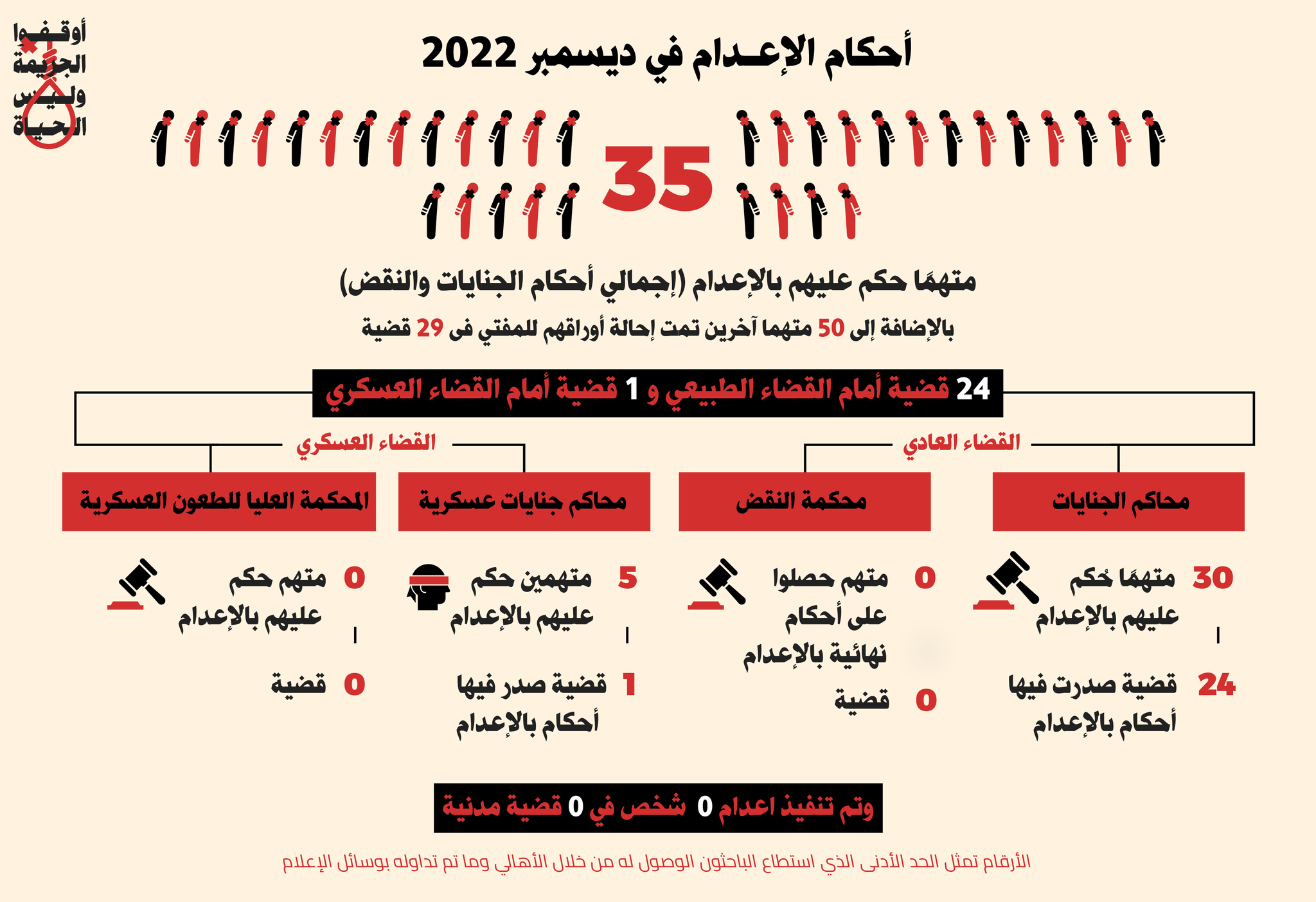 أصدرت المبادرة المصرية للحقوق الشخصية تقريرها الإحصائي الشهري ، بشأن عقوبة الإعدام في مصر، رصدت فيه صدور 35 حكما بالإعدام خلال ديسمبر الماضي، إضافة لإحالة أوراق 50 مواطنا في 29 قضية إلى مفتي العسكر تمهيدا للحكم بإعدامهم.