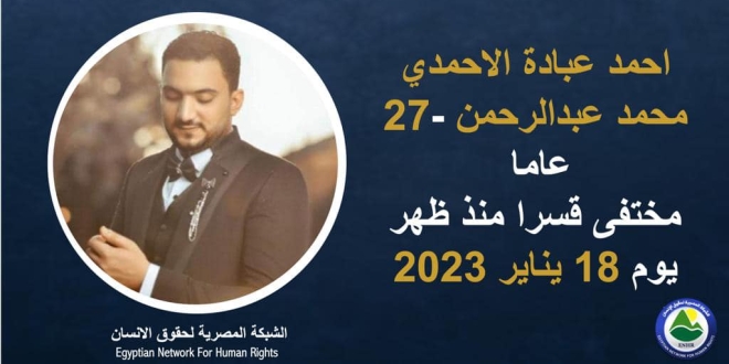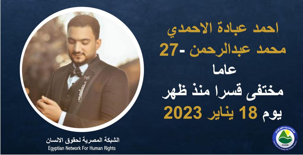 ووثقت الشبكة المصرية لحقوق الإنسان استمرار جريمة الإخفاء القسري للشاب أحمد عبادة الأحمدي محمد عبد الرحمن 27 عاما المقيم بقرية أولاد موسى مركز أبو كبير بمحافظة الشرقية ، وذلك بعد قيام الأمن الوطني بالشرقية ظهر يوم 18 يناير 2023 الماضي باعتقاله تعسفيا من محل عمله بإحدى الصيدليات بقرية أبو عمرو التابعة لنفس المركز، وتم اقتياده معهم في توكتوك إلى جهة غير معلومة حتى الآن.