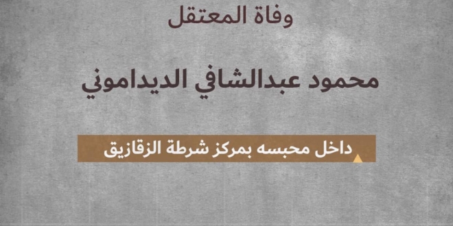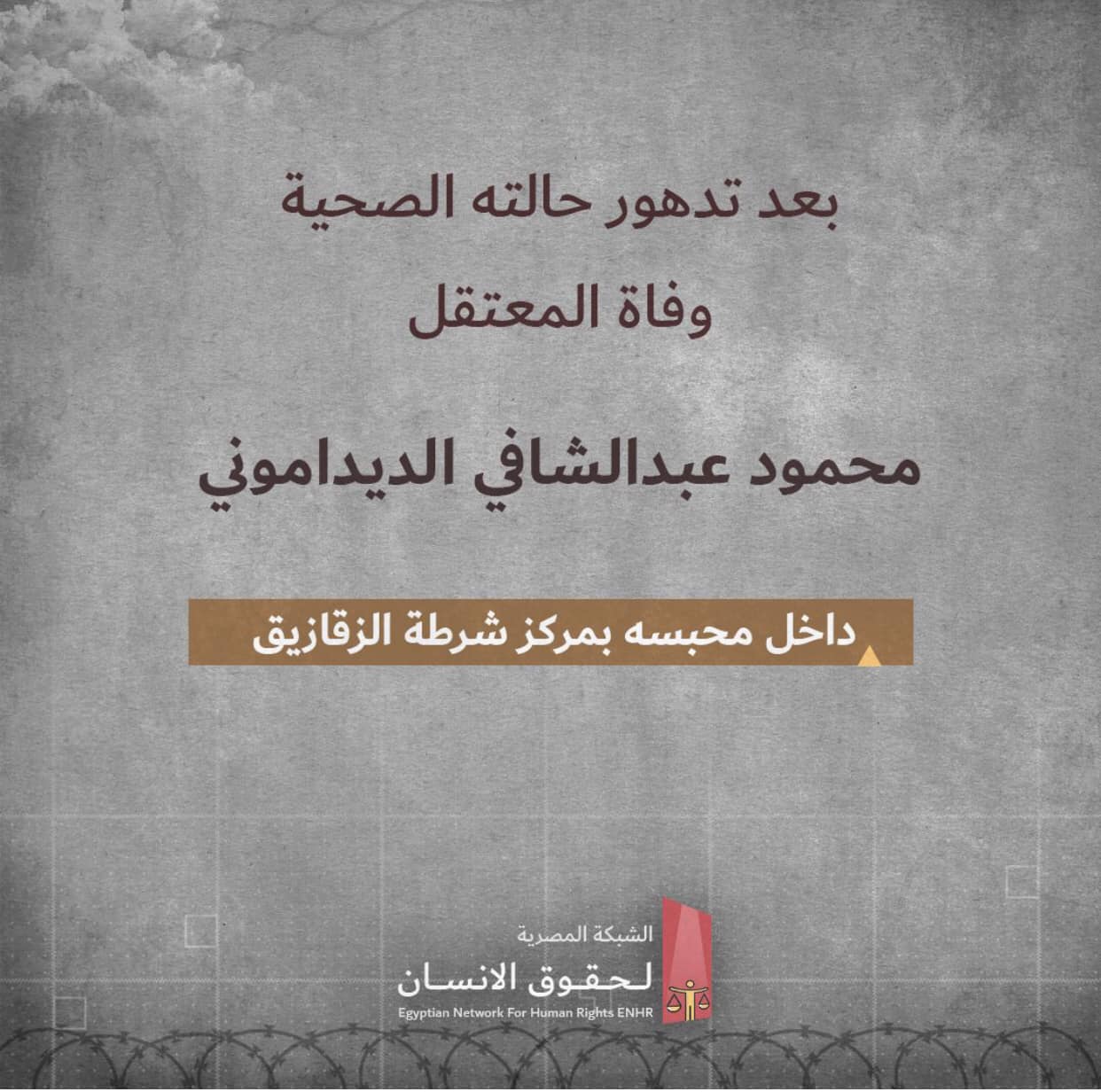 استشهد المعتقل محمودعبدالشافي الديداموني داخل محبسه بمركز شرطة الزقازيق بمحافظة الشرقية بعد تدهور حالته الصحية نتيجة لعدم تلقيه الرعاية الصحية اللازمة لحالته وظروف الاحتجاز المأساوية التي تفتقر لأدنى معايير حقوق الإنسان.