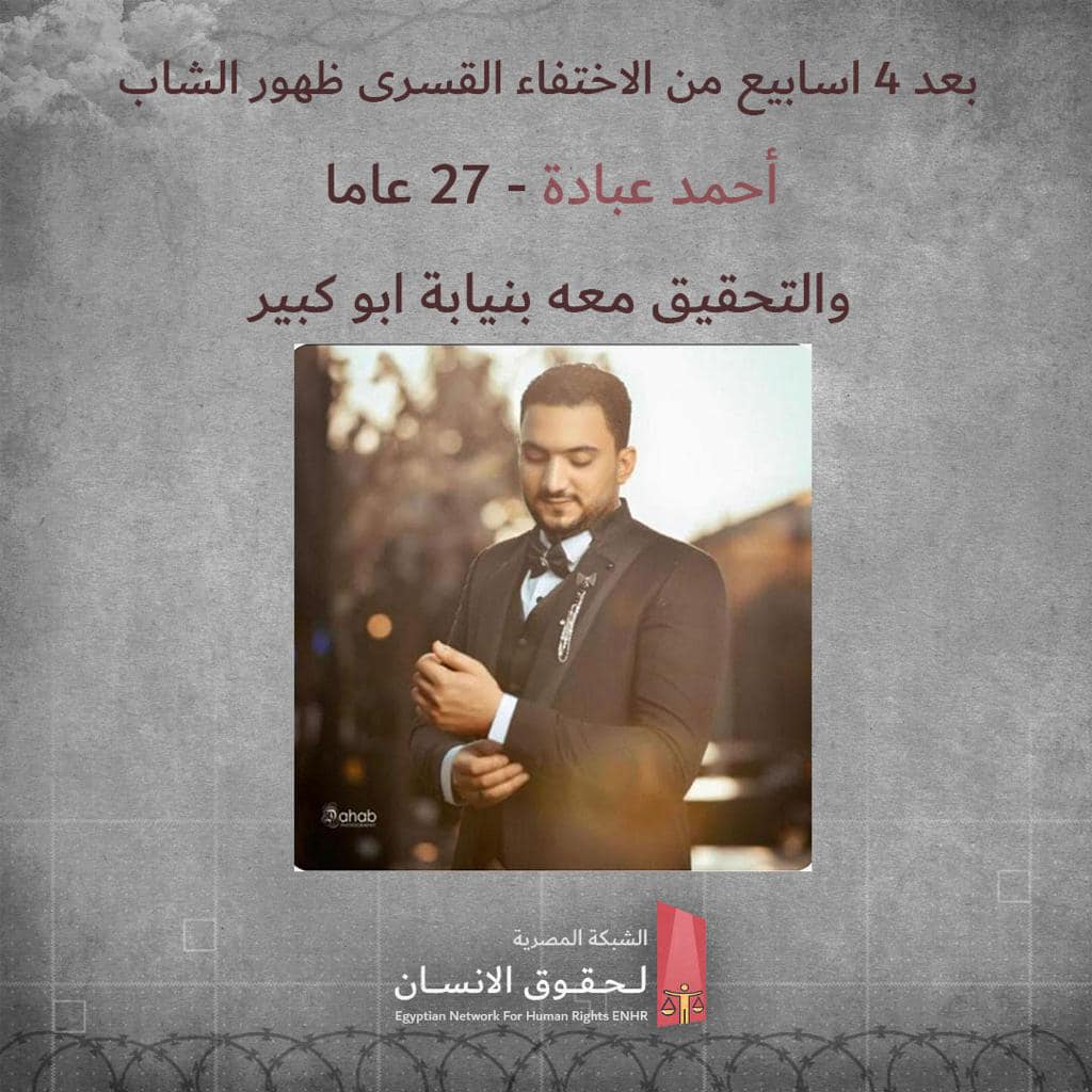 ظهر بعد 4 أسابيع من الاختفاء القسري والاعتقال التعسفي الشاب أحمد عبادة الأحمدي محمد عبدالرحمن، وتم التحقيق معه بنيابة أبو كبيربمحافظة الشرقية، وقررت حبسه 15 يوما على ذمة التحقيقات بزعم انضمامه إلى جماعة أُسست على خلاف القانون وتوزيع منشورات بحسب ما رصدته الشبكة المصرية لحقوق الإنسان .