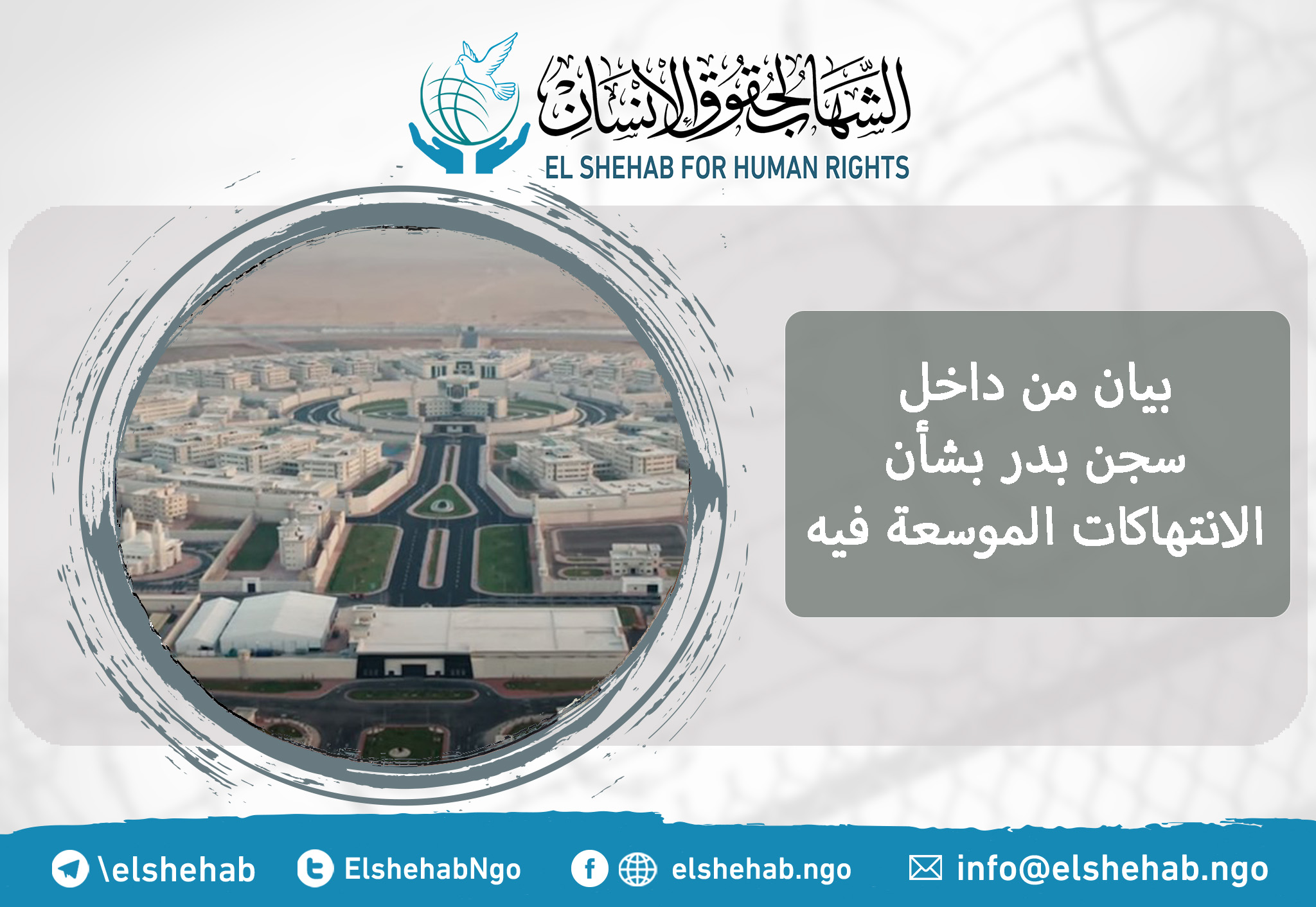 ونشر مركز الشهاب لحقوق الإنسان البيان الذي أشار إلى التعنت الشديد من إدارة سجن بدر٣ في عدم السماح للأهالي بزيارة ذويهم المعتقلين، الأمر الذي وصلت مدته إلى أكثر من ٧ سنوات، بالإضافة إلى انتهاكات أخرى بحق المعتقلين بينها عدم وجود تريض بشكل كلي لكل المحبوسين سواء احتياطيا أو محكومين وضعف الوجبات المقررة، حيث لا تكفي لإطعام طفل صغير، إضافة إلى الحالة الصحية المتدهورة والمأساوية، فضلا عن عدم وجود ماكينات للحلاقة أو شفرات مطلقا.