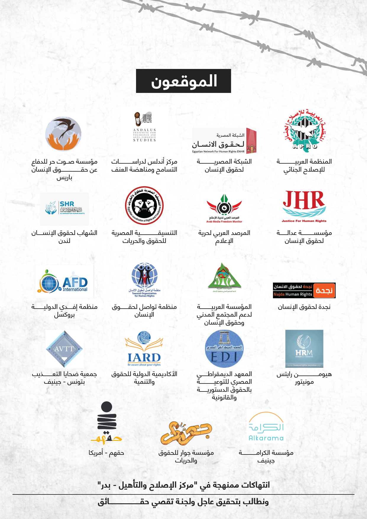 وطالبت المنظمات سلطات الانقلاب بالوقف الفوري لهذه الانتهاكات والتي تصنف جرائم تعذيب، والالتزام بسيادة القانون وسرعة تشكيل لجنة تقصي حقائق من المنظمات المستقلة، المصرية والدولية لزيارة السجن.