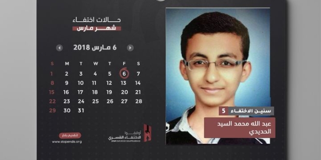 بالتزامن مع مرور 5 أعوام على جريمة الاعتقال التعسفي للمرة الثانية والإخفاء القسري لطالب كلية التجارة عبدالله محمد السيد الحديدي جددت حملة “أوقفوا الاختفاء القسري” مطلبها برفع الظلم الواقع على الحديدي ووقف ما يتعرض له من انتهاكات، والكشف عن مكان احتجازه القسري وسرعة الإفراج عنه .