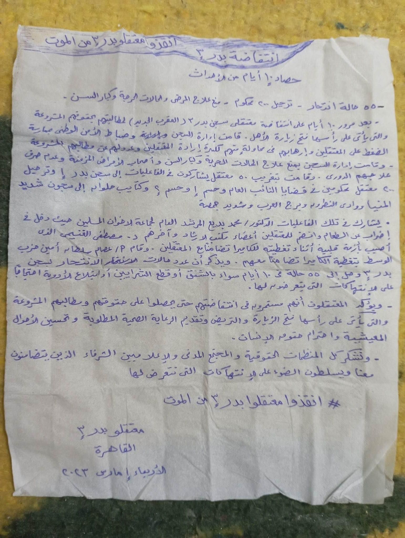الرسالة المكتوبة بخط اليد والمصورة من أعلى (بطانية) قالت إن "عدد محاولات الانتحار بسجن بدر 3 وصل إلى 55 حالة في 10 أيام سواء بالشنق أو قطع الشرايين أو ابتلاع الأدوية احتجاجا على الانتهاكات التي يتعرضون لها".