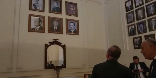 واصطحب وزير الانقلاب الوزير التركي في جولة تفقد فيها أقسام وزارة الخارجية ومتحفها، ووقف الاثنان أمام لوحة كبيرة تحمل صور رؤساء مصر بداية من العام 1952 وحتى الآن، وكانت اللقطة الأبرز فيها خلوها من اسم وصورة الرئيس الشهيد مرسي، وتلك هى المرة الأولى التى يفعلها وزير خارجية العسكر مع ضيف من دولة أخرى منذ الانقلاب العسكري ٢٠١٣.