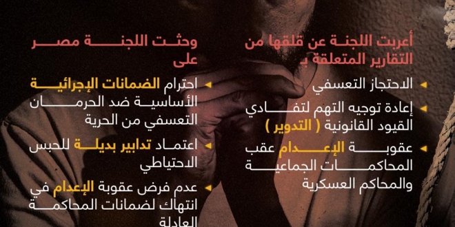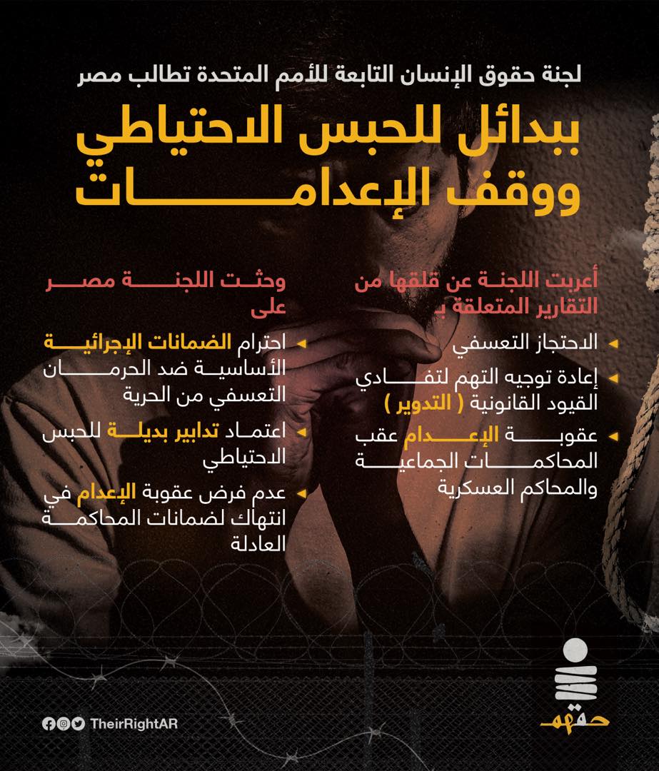 وطلبت اللجنة من مصر مراجعة إطارها القانوني الحالي لضمان عدم فرض عقوبة الإعدام على الإطلاق في انتهاك لضمانات المحاكمة العادلة وإيلاء الاعتبار الواجب لإلغاء عقوبة الإعدام.