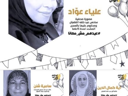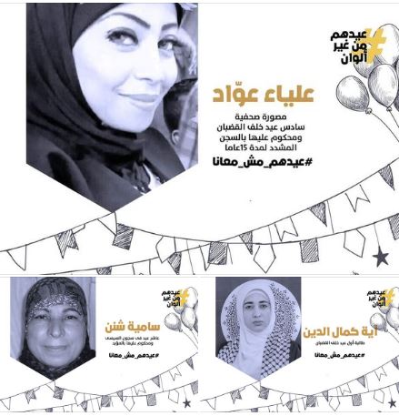 أيضا من بين هولاء المصورة الصحفية "علياء عواد " التي تقضي عيدها للمرة السادسة خلف القضبان بعد الحكم عليها من محكمة لم تتوافر فيها مواصفات التقاضي العادل بالسجن المشدد لمدة 15عاما .