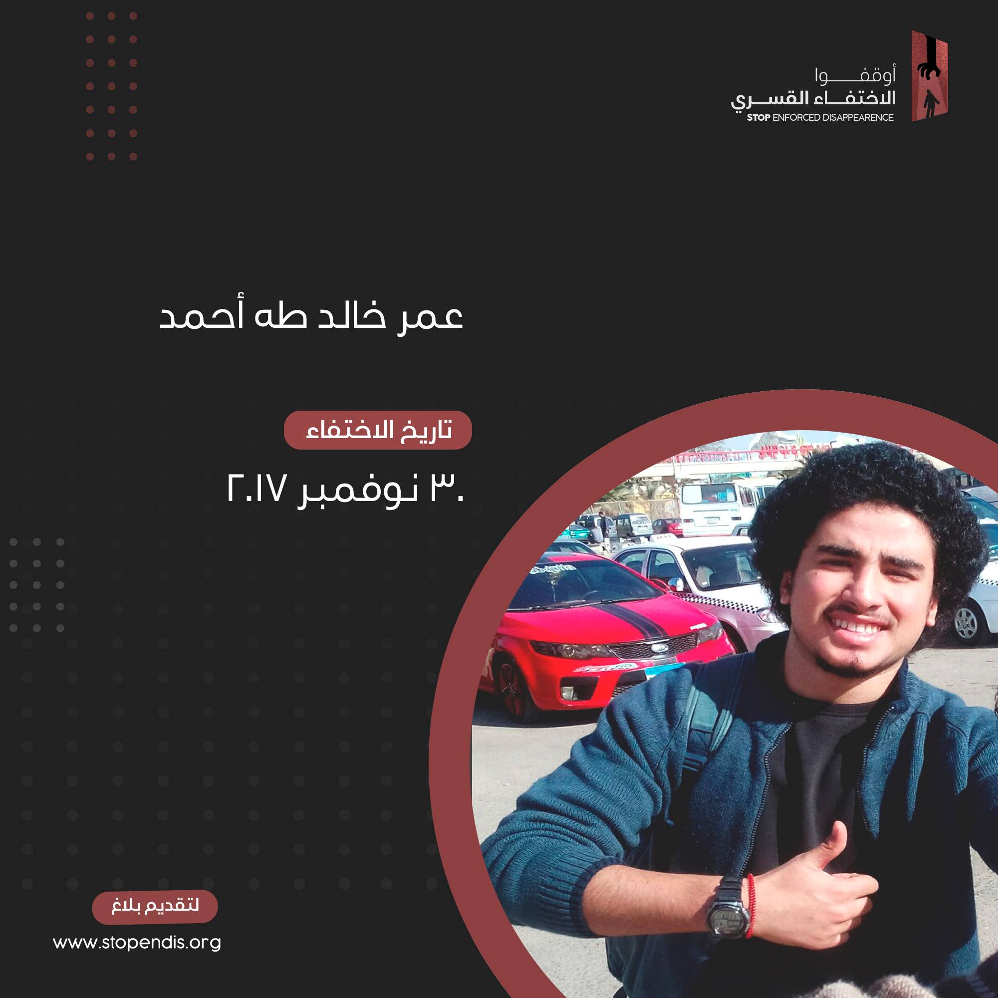 الجريمة ذاتها تتواصل بحق الشاب “عمر طه خالد” منذ أن تم اعتقاله بتاريخ 30 نوفمبر 2017 من محافظة أسوان، دون سند من القانون، واقتياده لجهة مجهولة حتى الآن.