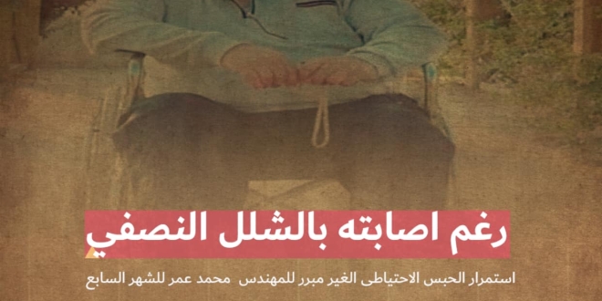 و رصدت الشبكة ووثقت استمرار الحبس الاحتياطي غير المبرر للشهر السابع للمهندس محمد عمر و المعتقل بسجن أبو زعبل 2 على ذمة التحقيقات في القضية 1977 لسنة 2022 حصر أمن دولة عليا ، رغم إصابته بشلل نصفي، واحتياجه إلى الرعاية الطبية والصحية باستمرار، وعدم قدرته على الحركة، ومعاناته داخل محبسه، واحتياجه إلى المساعدة.