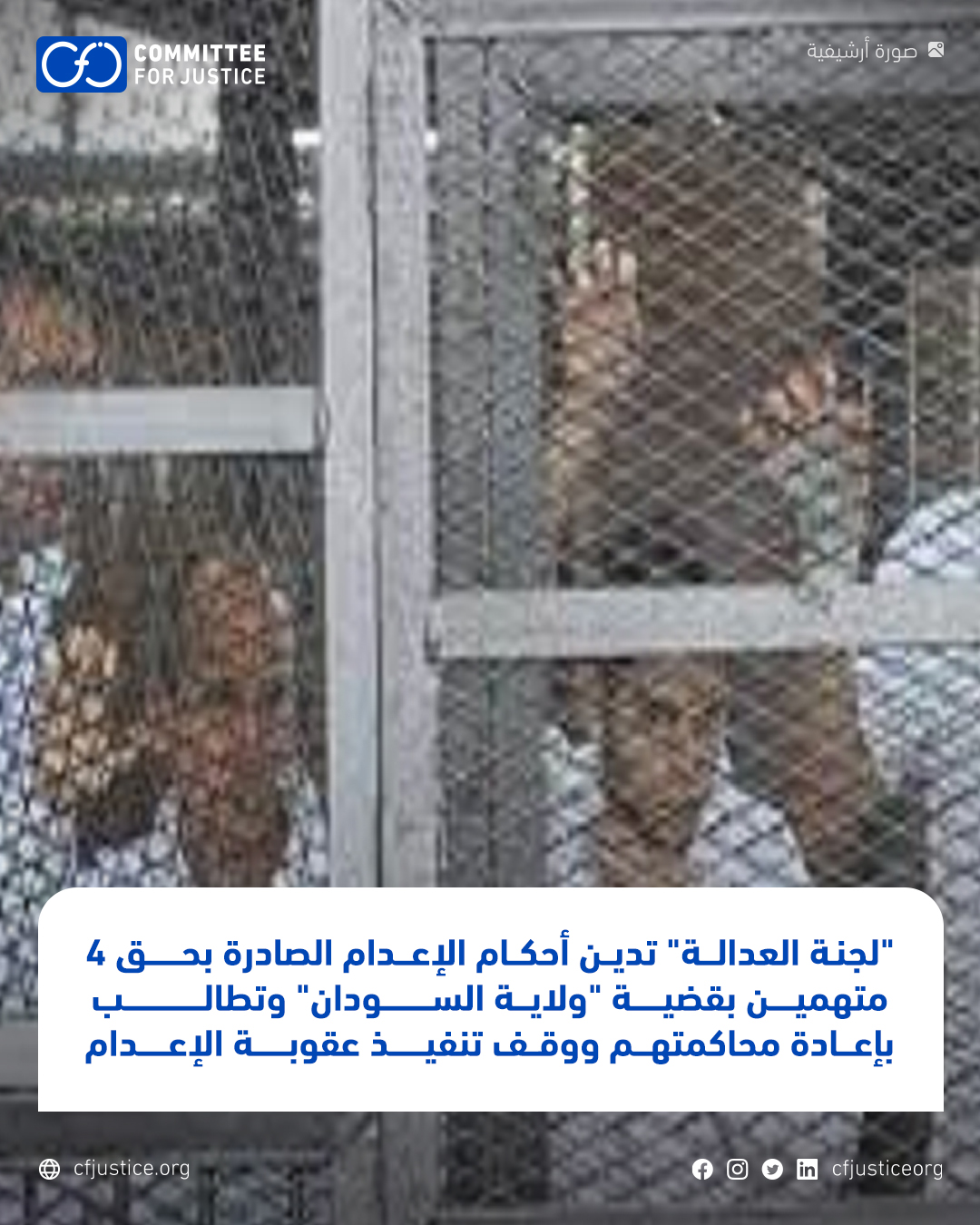 أدانت " لجنة العدالة " التي تتخذ من جنيف مقرا لها أحكام الإعدام الصادرة من محكمة جنايات أمن الدولة العليا المنعقدة بمجمع محاكم بدر، بحق 4 مواطنين في القضية رقم 19812 لسنة 2022 جنايات النزهة، والمقيدة برقم 347 لسنة 2022 جنايات أمن الدولة العليا، والمعروفة إعلاميا بما يسمى “ولاية السودان”، والمتهم فيها 9 منهم 7 حضوريا .
