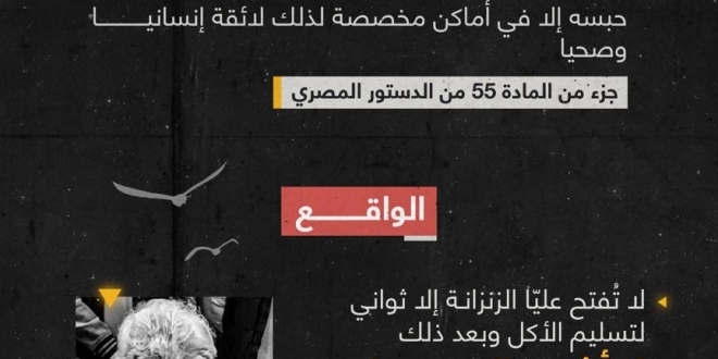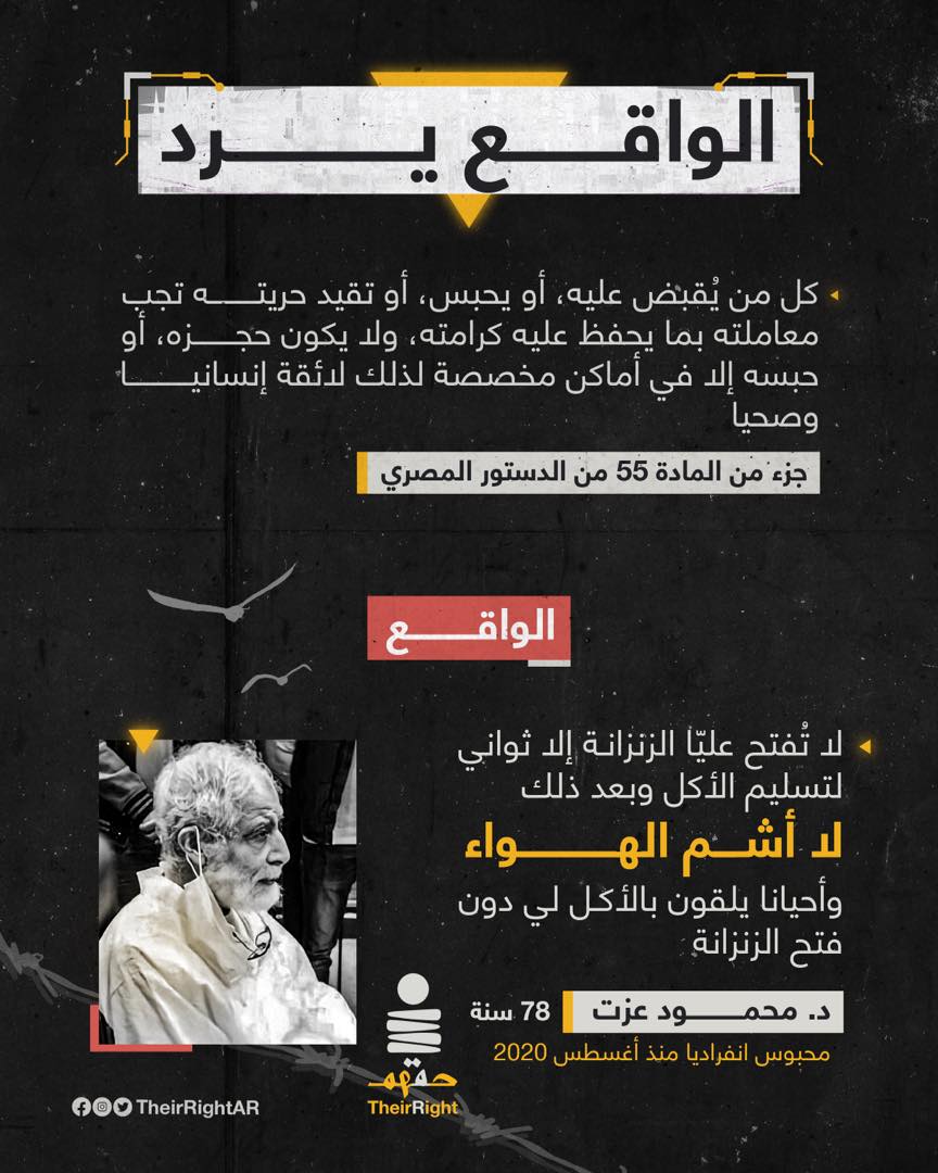 وأشارت إلى ما أورده الدكتور محمود عزت القائم بأعمال المرشد العام للإخوان المسلمين من انتهاكات يتعرض لها داخل محبسه الانفرادي؛ خلال كلمته أمام المحكمة، مؤكدا أنه يتعرض للعديد من الانتهاكات التي تخالف مواد الدستور والقانون واللائحة الداخلية للسجون داخل محبسه وقال : “لا تُفتح عليّ الزنزانة إلا ثواني ، لتسليم الأكل وبعد ذلك ، لا أشــم الهـواء ، وأحيانا يلقون بالأكل لي دون فتح الزنزانة “.