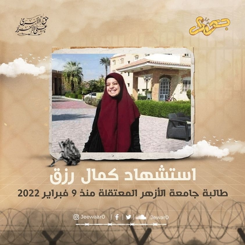 نددت منظمة "جوار" الحقوقية باستمرار التنكيل لطالبة اللغات والترجمة بـجامعة الأزهر استشهاد كمال رزق مرسي عيدية، التي يتواصل حبسها احتياطيا، بعد اعتقالها تعسفيا من منزلها بمركز بلبيس بمحافظة الشرقية في شهر نوفمبر 2020.
