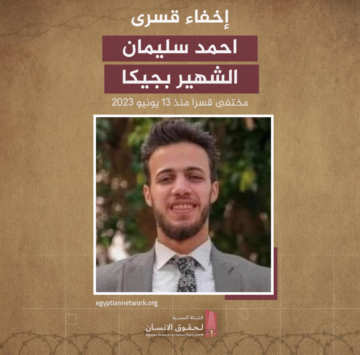 إلى ذلك رصدت الشبكة المصرية لحقوق الإنسان، استمرار الأمن الوطني بقليوب بمحافظة القليوبية في احتجاز خارج نطاق القانون للشاب أحمد حمدي السيد سليمان، الشهير بـ”جيكا” البالغ من العمر 26 عاما، وذلك بعد توجهه يوم الثلاثاء 13 يونيو الماضي إلى المتابعة الدورية المفروضة عليه منذ سنوات في مباحث الأمن الوطني بشبرا الخيمة، ليتم اصطحابه بعدها بساعات إلى منزله وتفتيشه والقبض عليه، ومنذ ذلك التاريخ لم يتم عرضه على أي جهة تحقيق.