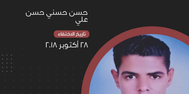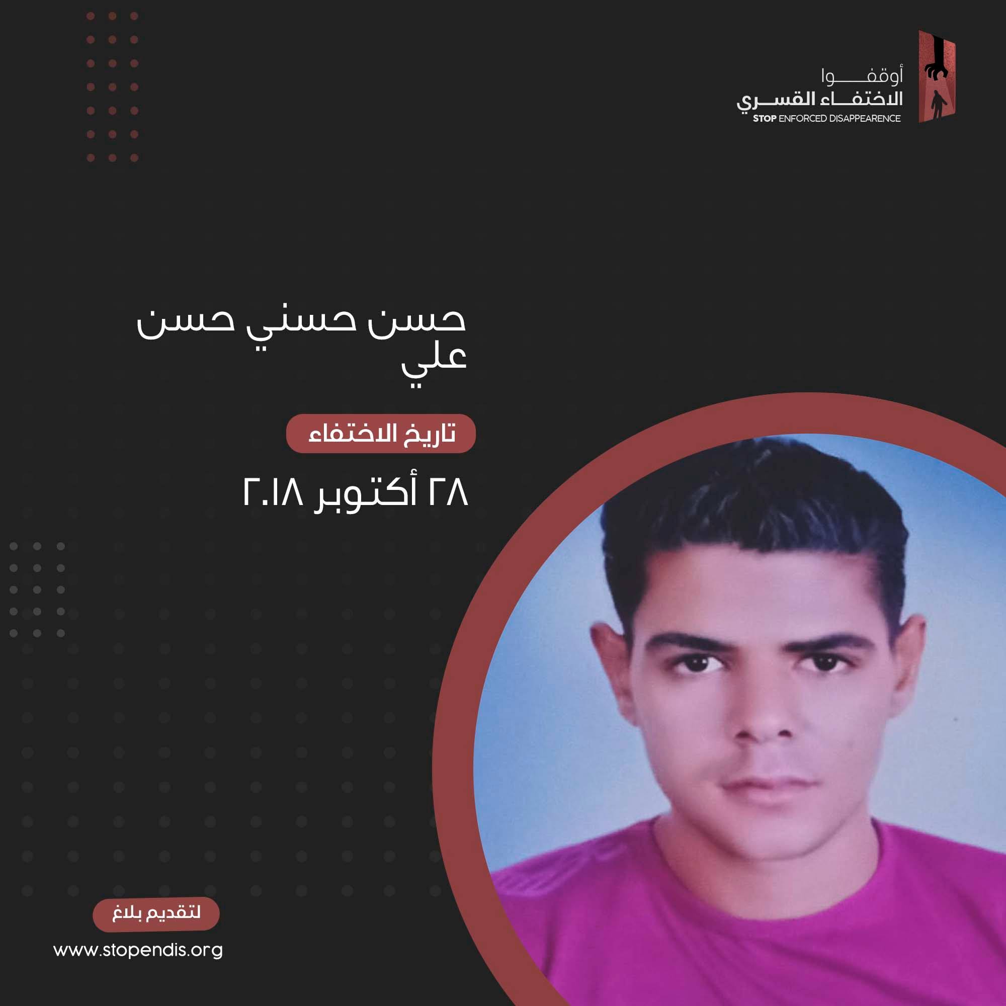 وفي الإسماعيلية تتواصل جريمة إخفاء الشاب حسن حسني حسن علي، يبلغ من العمر 28 عاما منذ أن تم اعتقاله تعسفيا بتاريخ 28 أكتوبر 2018 دون سند من القانون .