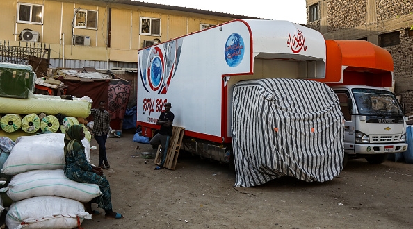 CAIRO, EGYPT - APRIL 25: Sudanese citizens stand next to parked freight trucks on April 25, 2023 in Cairo, Egypt. The evacuation operations launched by various countries for their nationals or their diplomatic personnel continue in a high-risk setting while the war between the army and paramilitaries has been raging since April 15 in Sudan. Although a 72-hour cease fire was announced, residents of the Sudanese capital remain in a critical situation. (Photo by Fadel Dawod/Getty Images)