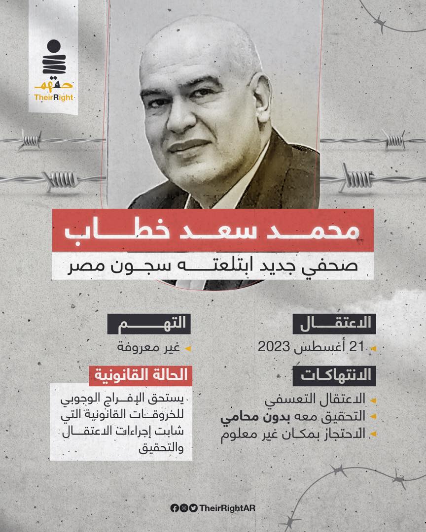 رصدت منظمة “حقهم” المعنية بالدفاع عن معتقلي الرأي والمختفين قسريا اعتقال سلطات الانقلاب للصحفي محمد سعد خطاب، مساء الاثنين 21 أغسطس 2023 من منزله، بعدما عبر عن رأيه بتغريدة.