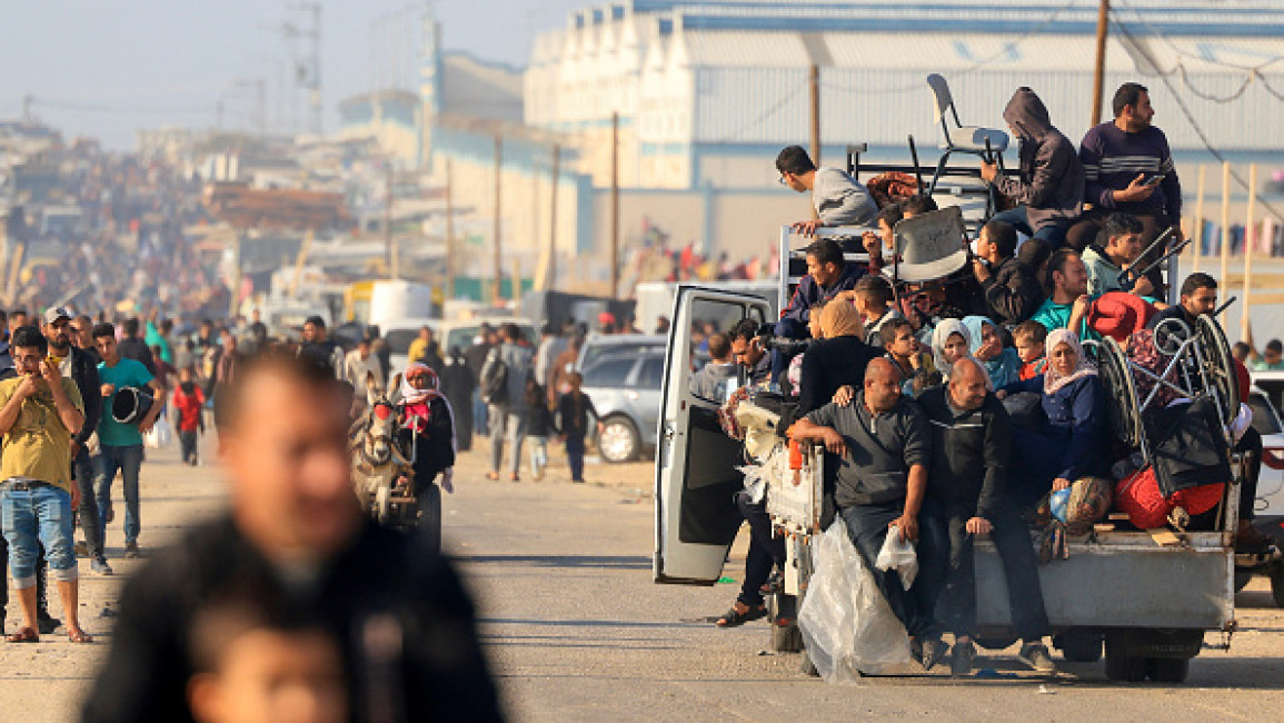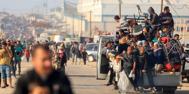 ومع استمرار القتال في المناطق التي كانت تحتلها دولة الاحتلال سابقا، تضمنت استراتيجيتها لإعادة توطين المدنيين إلقاء منشورات، وإصدار مكالمات هاتفية، وبث إذاعي وتلفزيوني يأمر بإجلاء مئات الآلاف من السكان الفلسطينيين جنوبا، مع تركز جميع السكان تقريبا البالغ عددهم مليوني نسمة هناك.