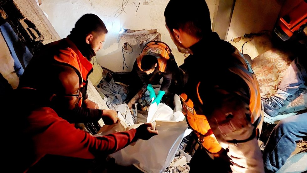 وانتشلث جثامين 5 شهداء بعد استهداف قوات الاحتلال منزلا لعائلة الحج أحمد بمخيم المغازي وسط قطاع غزة.