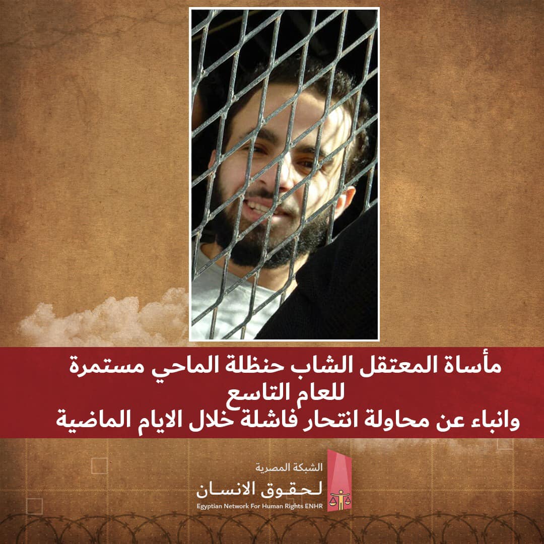 كشفت الشبكة المصرية لحقوق الإنسان أن سلطات أمن الانقلاب بسجن برج العرب نقلت المعتقل الشاب حنظلة أحمد الماحي، 31 عاما إلى مستشفى السجن لعلاجه بعدما عانى خلال الفترة الماضية من التقئ دم وذلك بعد محاولة انتحار فاشلة خلال الأيام الماضية.