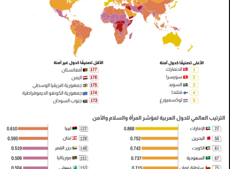ويغطي مؤشر المرأة والسلام والأمن الصادر عن معهد جورج تاون للمرأة والسلام والأمن ومعهد أبحاث السلام في أوسلو 177 دولة واقتصادا بشأن وضع المرأة، ويستند المؤشر إلى تسجيل 13 مؤشرّا لوضع المرأة في الإدماج العدالة والأمن.