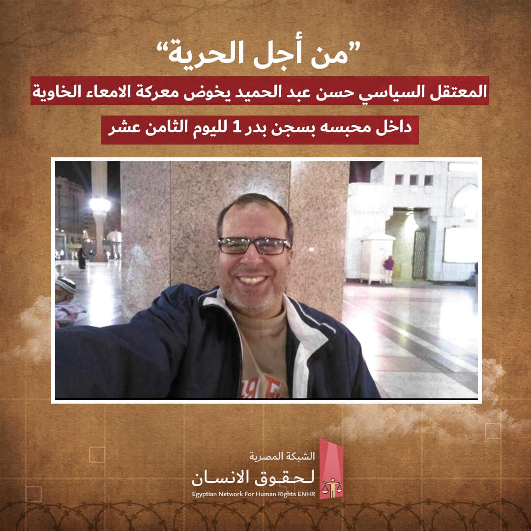 رصدت الشبكة المصرية لحقوق الإنسان استمرار المعتقل السياسي حسن عبد الحميد حسن، 55 عاما، مهندس معماري، في إضرابه المفتوح عن الطعام لليوم الثامن عشر، داخل محبسه بمركز بدر للإصلاح والتأهيل بدر 1.