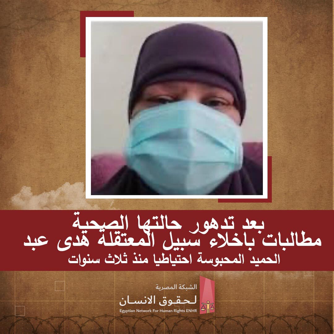 وطالبت الشبكة المصرية النائب العام المصرى بإخلاء سبيل هدى عبدالحميد بعد تدهور حالتها الصحية وبعد تجاوز فترة حبسها العامين وهى الفترة القانونية للحد الأقصى للحبس الاحتياطى بحسب المادة 143 من قانون الإجراءات الجنائية.